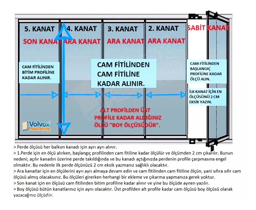 Cam Balkon ve diğer uygulama alanlarında Plise Perde için ölçü almak çok önemlidir. Öncelikle sabit kanat ile ölçüye başlayabilirsiniz. (sağa sola kaymayan) kanatları belirleyiniz. Diğerlerine göre ölçüsü farklıdır genelde. Ölçü alma işlemi camın enini ve boyunu ölçmektir. Siz bu ölçüleri alınız biz gerekli düşümleri yapıp size geri dönüş sağlarız.