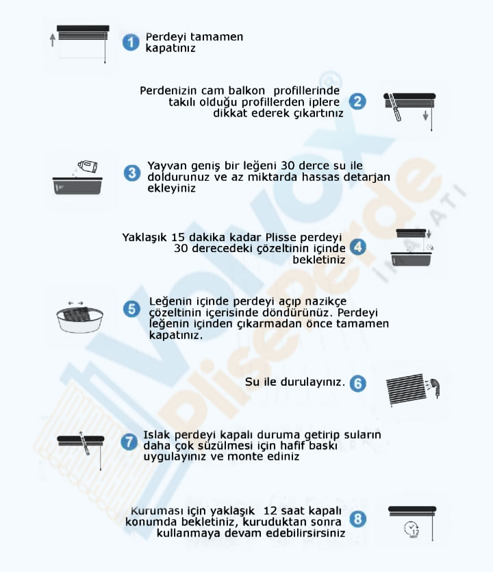 Volvox Plise Perde, polyester kumaştan üretilmiş perdeleriyle mükemmel bir temizlik ve dayanıklılık sunar. Kolayca kir tutmayan ve neme karşı dirençli olan bu perdeler, uzun süre rahatsız edici bir şekilde kirlenmezler. Pratik bir temizlik için sadece nemli bir sünger yeterlidir. Ayrıca, kumaşı mekanizmadan kolayca çıkarılarak yıkanabilir, böylece her zaman taze ve temiz bir görünüm elde edebilirsiniz. Volvox Plise Perde ile evinizin veya iş yerinizin perdelerini temizlemek artık çok daha kolay!
